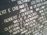 Today, Jesse and I had the opportunity to see a 3/5 scale, traveling exhibit of the Vietnam Memorial. That feeling of reverence was there, too. Once again I found Curtis D. Miller on the wall. Jesse also found the name of Robert J. Gordon, one of his cousins who was killed in the battle Kaesong.